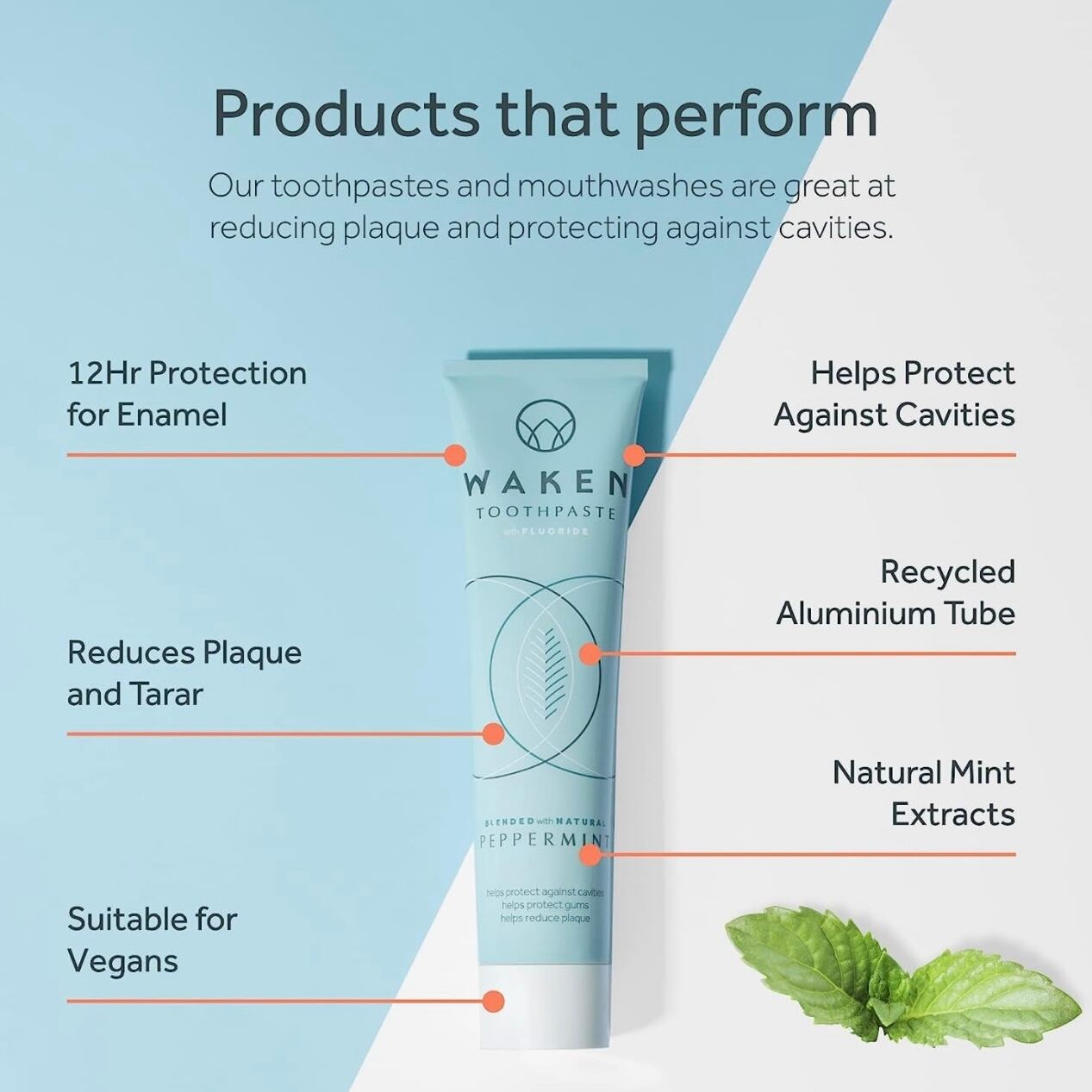 Wakenのペパーミント歯磨きペーストで、さわやかなブレスを手に入れ、輝く白い歯と健康な口内環境を維持しましょう。