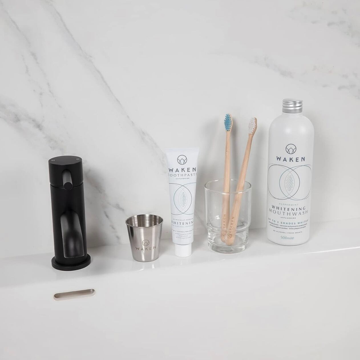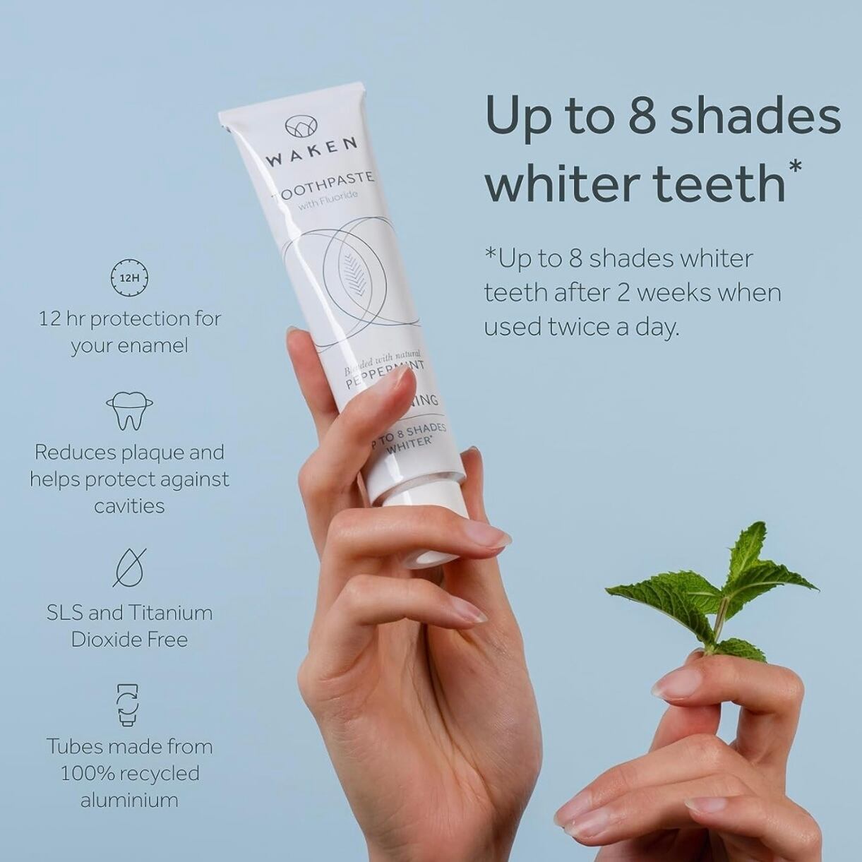 Wakenのホワイトニング歯磨きペーストは、あなたの日々の口腔ケアに自然な輝きと清涼感をもたらします。真のペパーミントエキスを繊細にブレンドし、息を新鮮に保ちながら歯を美しく白くします。